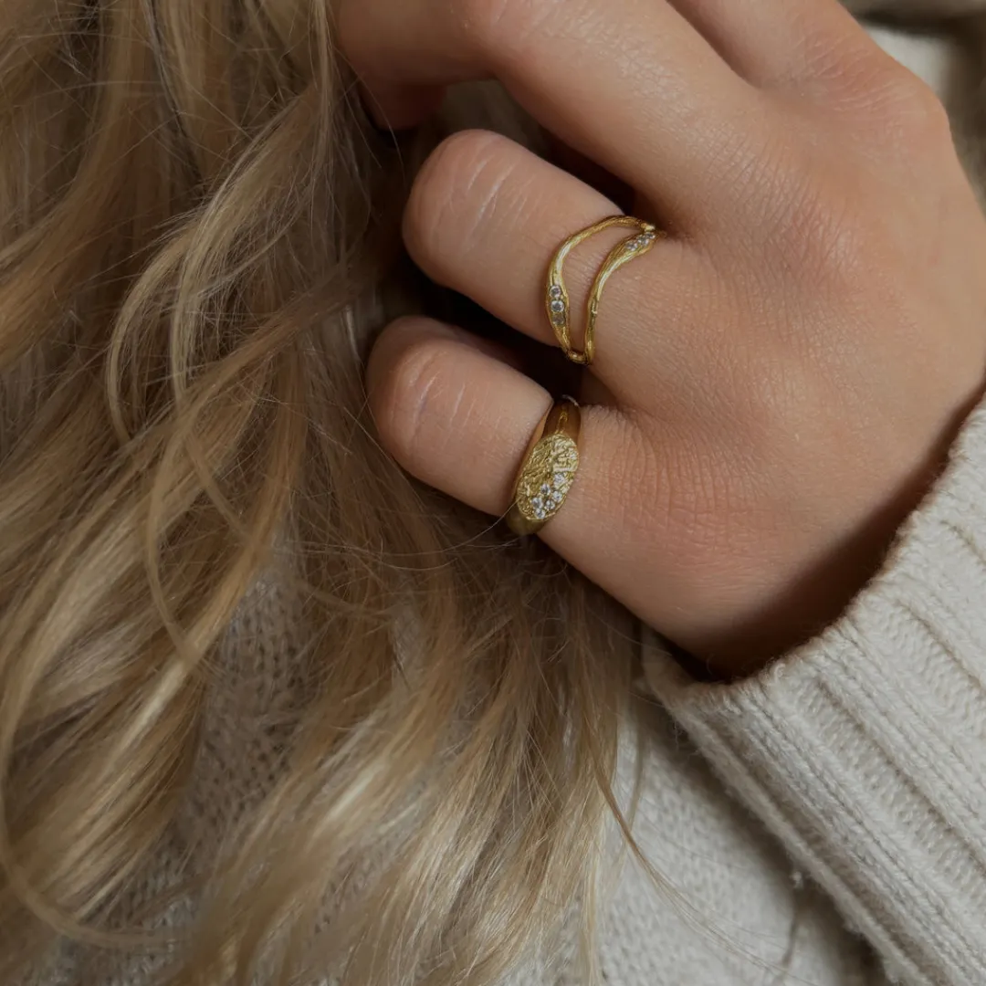 The Alizeh ring is a beautiful addition to the Elements Collection. The ring is a smaller signet ring with an organic and beaten expression on the top, as well as lots of small cubic zirconia. The ring is a classic ring with a twist and can easily be styled with other rings due to its different surfaces.