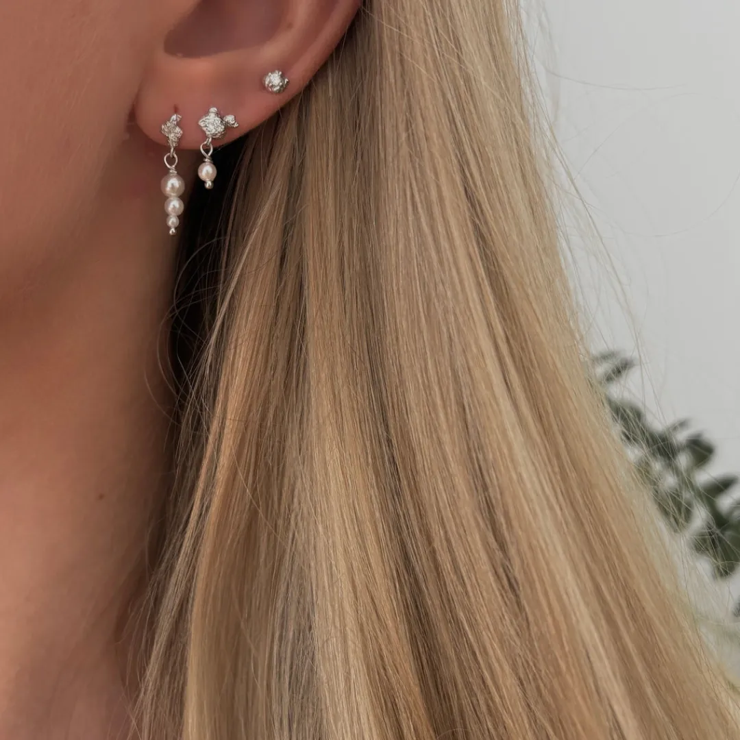 Avani Earrings are a pair of small, elegant earrings with beautiful details. The earrings have a clear cubic zircon and a small freshwater pearl. They are perfect for everyday use due to their fine size and they are easy to combine with other earrings for a more stacked look.